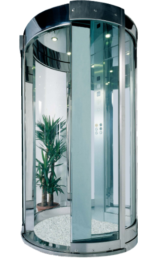 Cabina panoramica semitonda realizzata con porte curve in cristallo di sicurezza e parete di fondo con angoli, zoccolatura e profili in acciaio lucido a specchio.